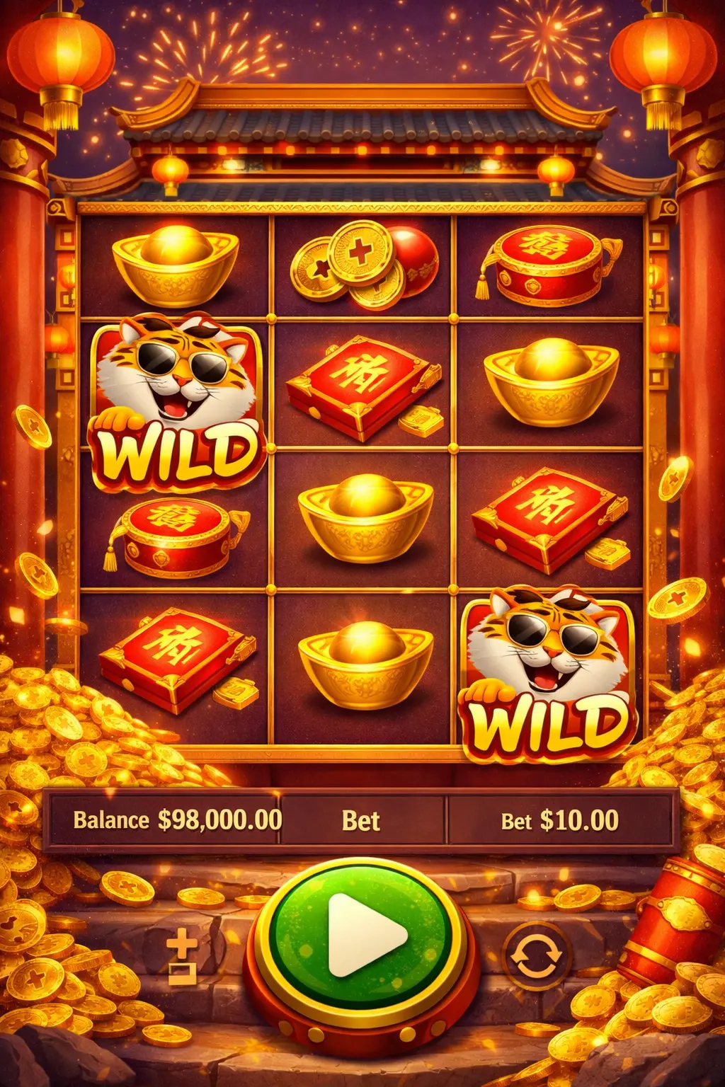 Em volta do tigre, o restante conjunto simbólico normalmente recorre a elementos ligados à riqueza, à celebração e à fortuna. Moedas douradas, objectos ornamentais, detalhes em vermelho e referências gráficas associadas à prosperidade ajudam a construir um campo visual coerente. Nada disso é gratuito. Esta selecção estética serve para reforçar a sensação de unidade. O jogador não sente que os símbolos foram reunidos aleatoriamente. Sente que existe um mundo específico, com regras visuais claras e uma intenção reconhecível por trás de cada escolha.